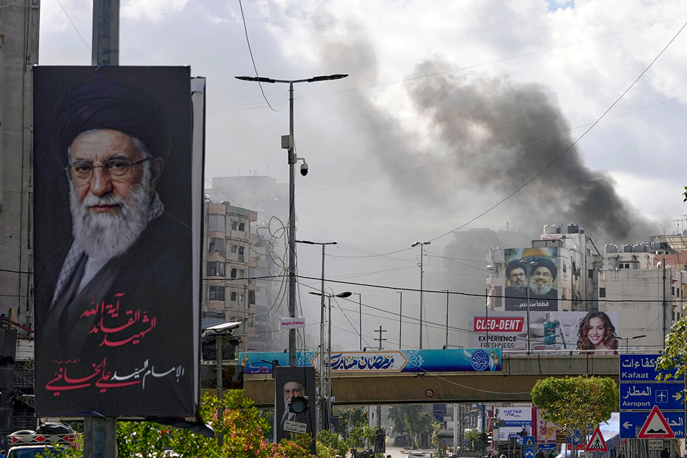 A portrait of Iran’s late Supreme Leader Ayatollah Ali Khamenei, left, is seen, as smoke rises following an Israeli airstrike in Dahiyeh, Beirut’s southern suburbs, Lebanon, Monday, March 30, 2026. (AP Photo/Hassan Ammar)